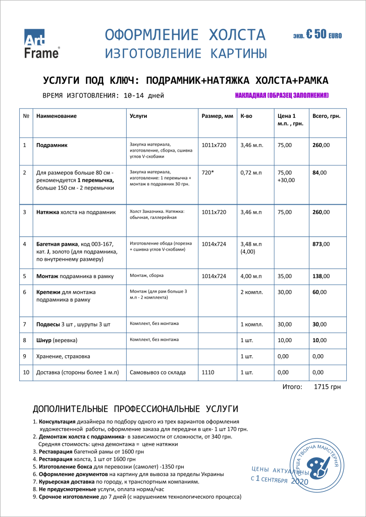«Оформление работ в багетную раму», «Монтаж картины в рамку» — услуги оформительской мастерской, дополнительные. В стоимость багетной рамы не включены! Стоимость услуги рассчитывается по прайсу или индивидуально при сложности монтажа.