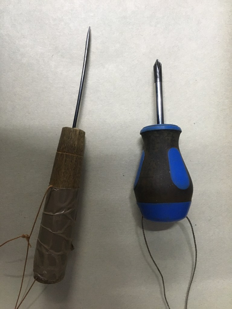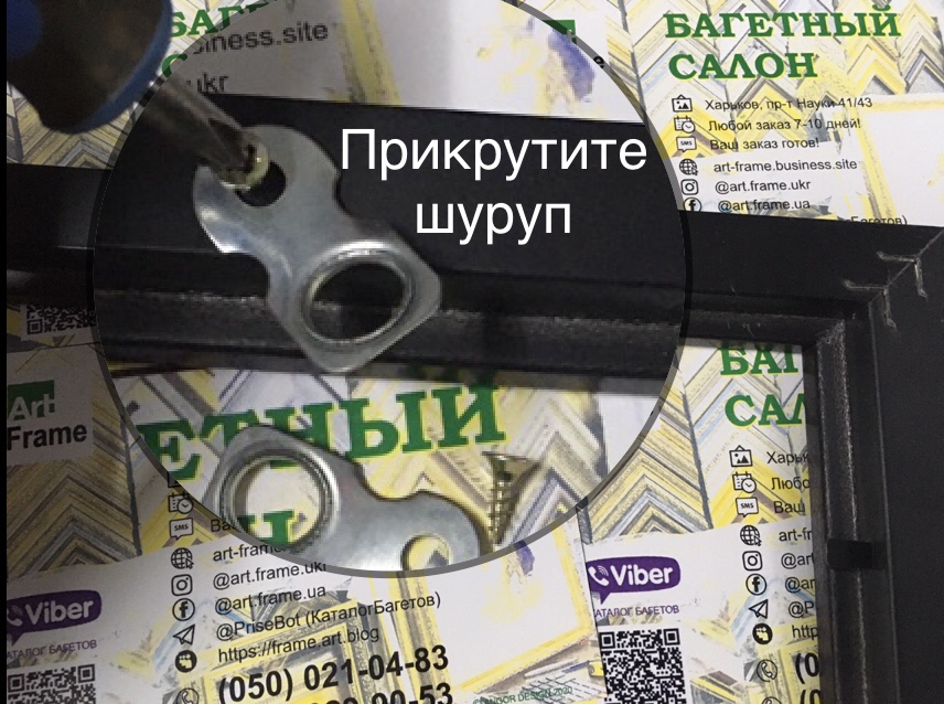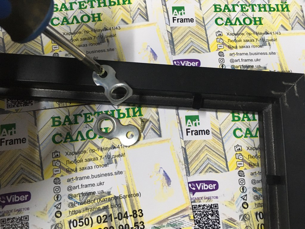 С задней стороны багетной рамки , сверху, по середине отмечаете маркером место, где будет находиться навес. Шилом в отмеченном месте делаете небольшое отверстие. Устанавливаете в это место навес, вставляете шуруп и закручиваете его отверткой. За него вешаете рамку на гвоздь или крючок в стене. Для небольших размеров достаточно одного навеса, но можно использовать два навеса и шнур: располагаются по бокам рамки или подрамника друг напротив друга на 1/4 от верха, между ними натягивается шнур, за который вещается картина на крючок в стене. Для больших размеров, тяжелого изделия в багетной рамке мы рекомендуем использовать три навеса, прикручивать к багету в форме треугольника, между ними натянуть шнур.